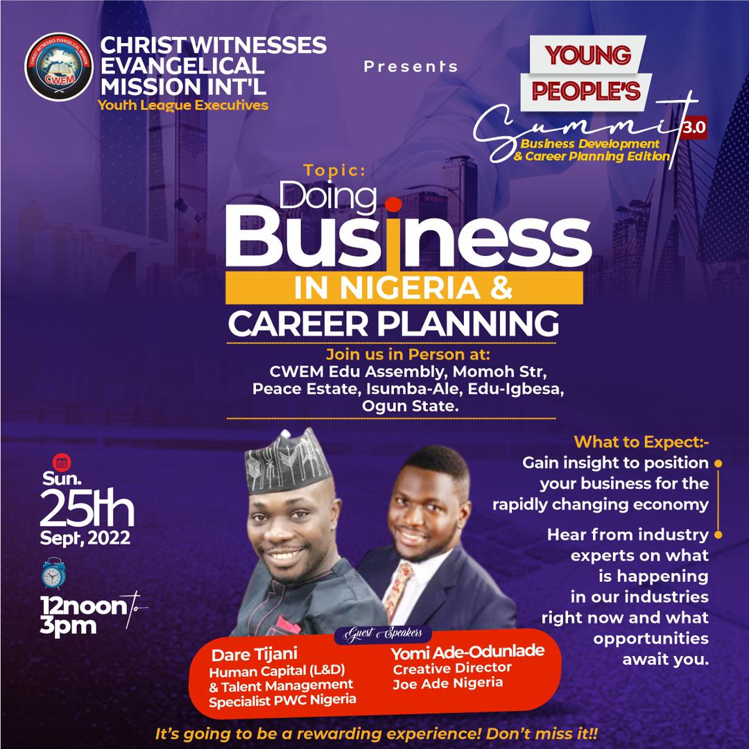 The Christ Witnesses Evangelical Mission International (CWEM) Youth League Executives hosted UMMI 3.0, a special edition focused on Business Development and Career Planning, on Sunday, September 25th, 2022, at the CWEM Edu Assembly, Peace Estate, Isumba-Ale, Edu-Igbesa, Ogun State. Themed around empowering young people to thrive in Nigeria’s evolving business landscape, the event featured insightful sessions from industry experts including Dare Tijani, a Human Capital and Talent Management Specialist at PwC Nigeria, and Yomi Ade-Odunlade, Creative Director of Joe Ade Nigeria. Attendees gained practical strategies for positioning their businesses in a rapidly changing economy and explored emerging career opportunities, making it an inspiring and rewarding experience for all participants.