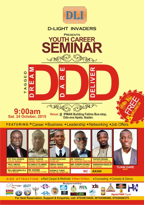 The D-Light Invaders (DLI) hosted the Youth Career Seminar 2015 on Saturday, October 24th, at the IPMAN Building, Odo-Ona Apata, Ibadan, creating a vibrant platform for young professionals to explore opportunities in career, business, leadership, and networking. The event, themed “DDD”, featured seasoned speakers and industry leaders, including Pst. Poju Johnson (YATLEC, Ibadan), Paul Amusa (Senior Manager, DTR), Williams Babalola (P&G, Ibadan), Adebayo Olaniyan (CEO, TONS Dev. Ltd.), and several other accomplished executives. Hosted by Tijani Dare, the free event—with brunch provided—offered red carpet moments, medical checkups, counseling, comedy, and dance, blending professional insights with an engaging and inspiring atmosphere for youth empowerment and career growth.